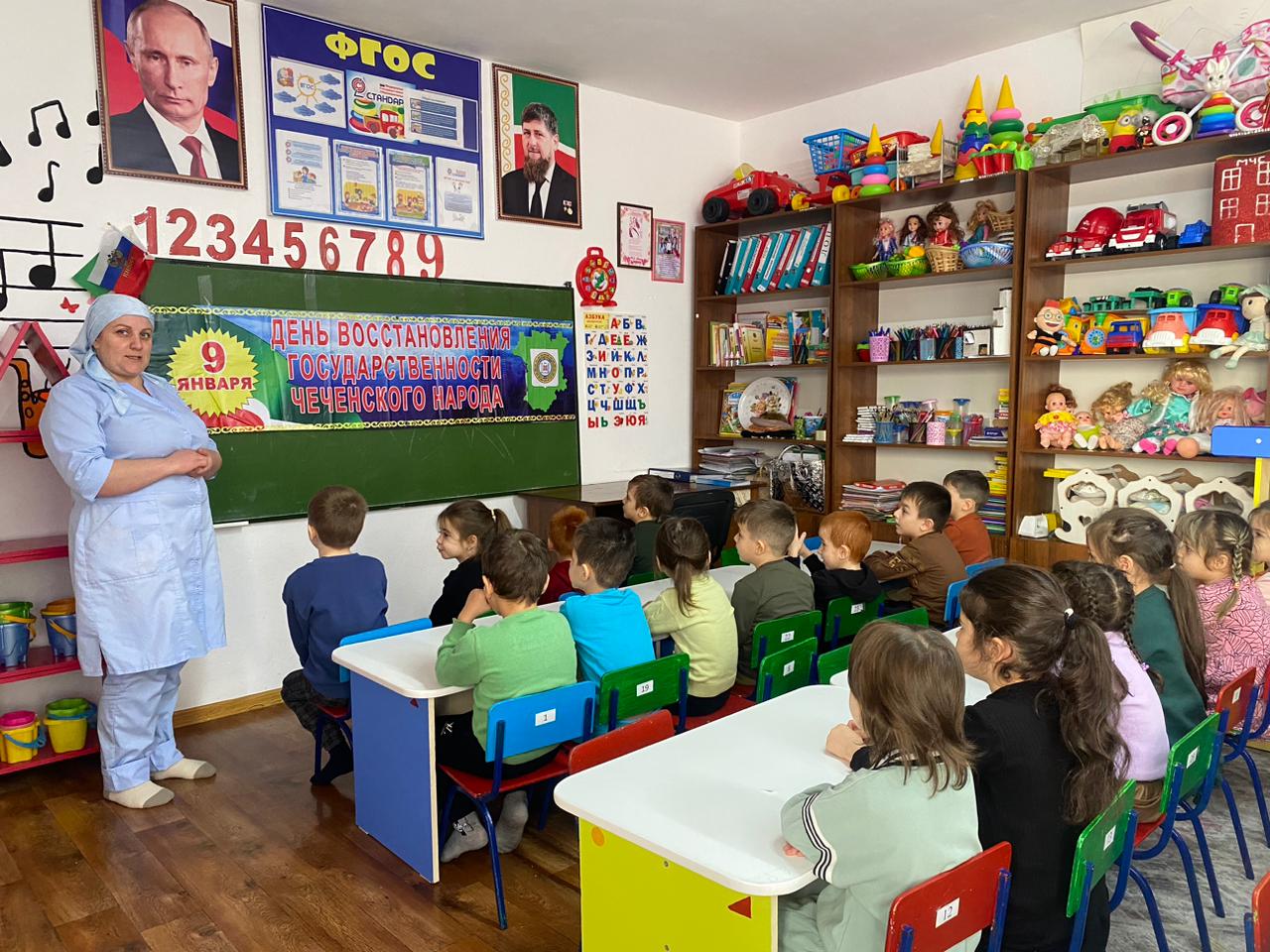 09.01.2024Согласно годовому плану работы ис целью ознакомления с историей чеченского народа, привития любви кмалой Родине, 09.01.2023 года с воспитанниками старшей группыбыли проведены тематические беседы, посвященныеДню восстановления государственности чеченского народа.