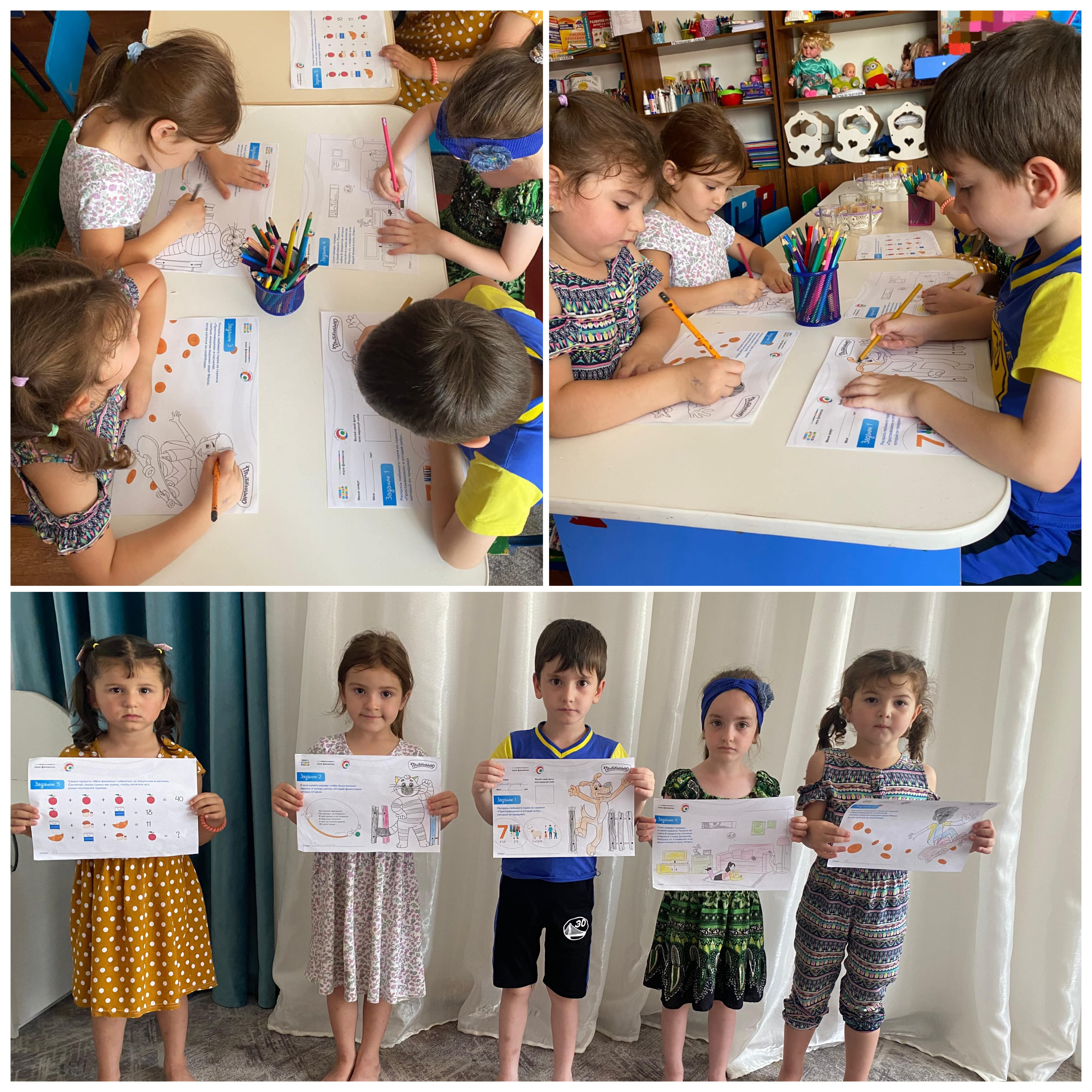 Во время занятия ребятам было необходимо раскрасить любимых героев из сериала «Простоквашино», отгадать ФинЗОЖ ребус, который придумал Кот Матроскин, и посчитать, сколько монеток выронил дядя Фёдор, когда катался на скейтборде, а так же отгадать загадки на тему финансов от Шарика.