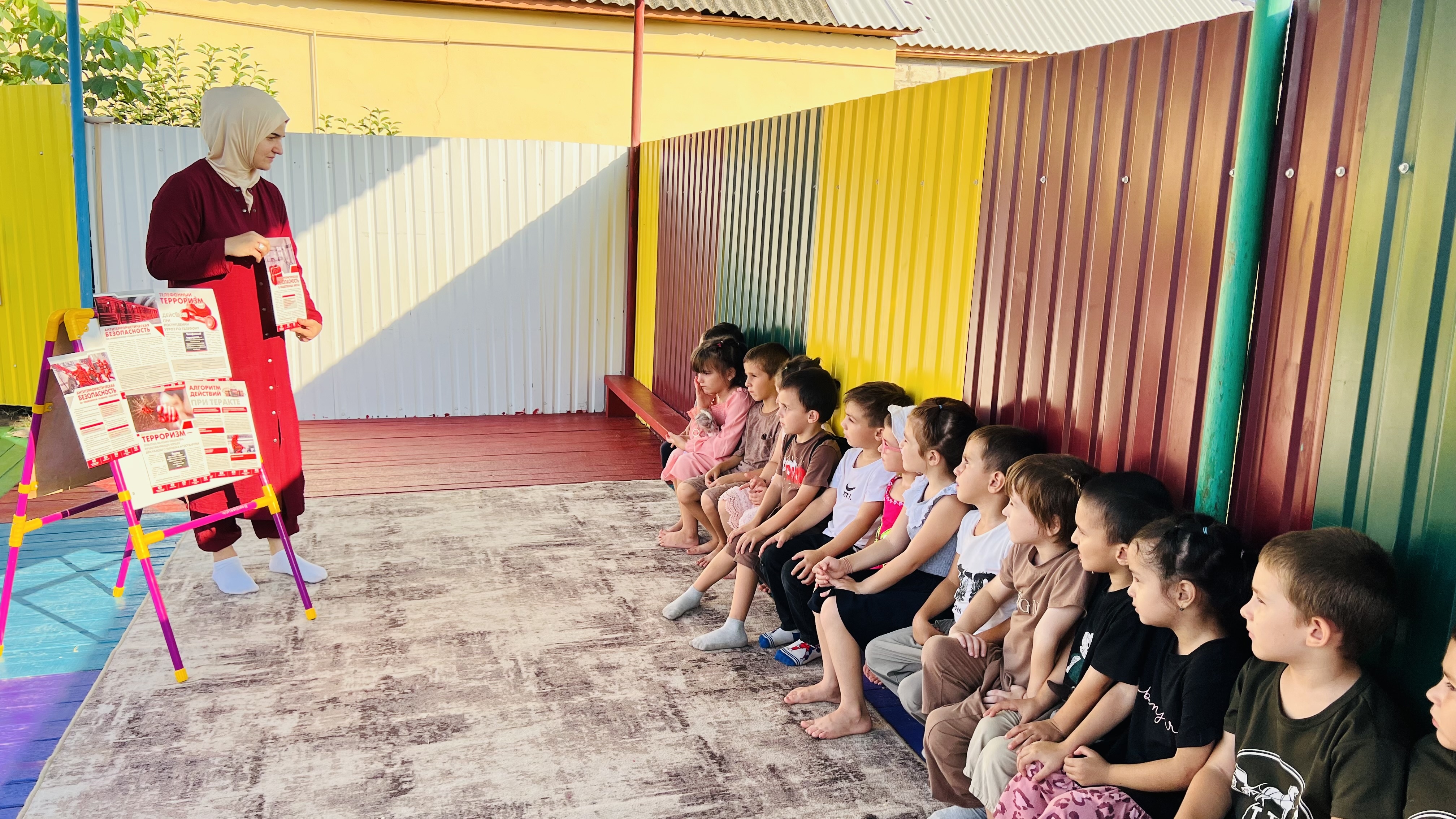 С детьми в доступной форме обсудили понятие терроризма, объяснили, что террористические действия несут опасность для всех людей. Проведена инсценировка «В незнакомом месте бывает обманчиво», где дети закрепили правила осторожного поведения при встрече с незнакомыми людьми.